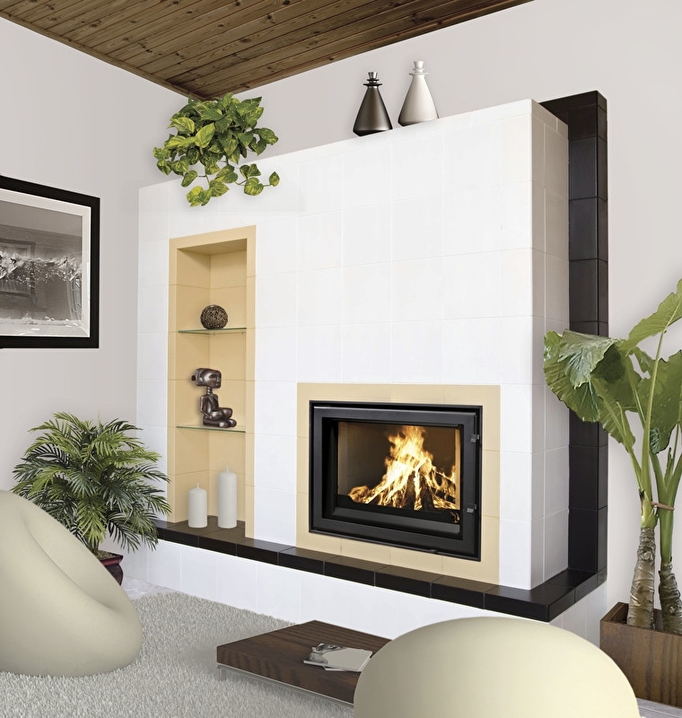 OverzichtCompakte modern vorm gegeven cv-haard met draaideur.